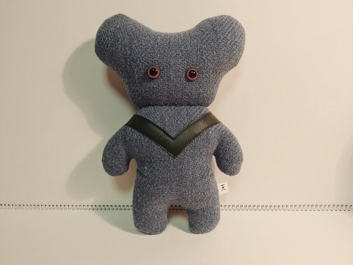 宇宙人のイメージで作ったぬいであります。胸にかけてのV字がキュートです。フォーマルな素材感。そんな子です。