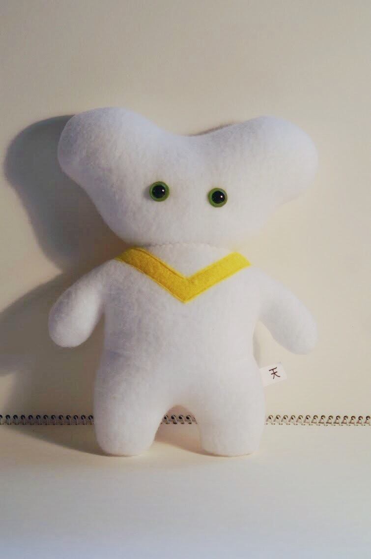 宇宙人の子です。白くて大福のようです。宇宙人のイメージで作ったぬいであります。胸にかけてのV字がキュートです。フォーマルな素材感。そんな子です。