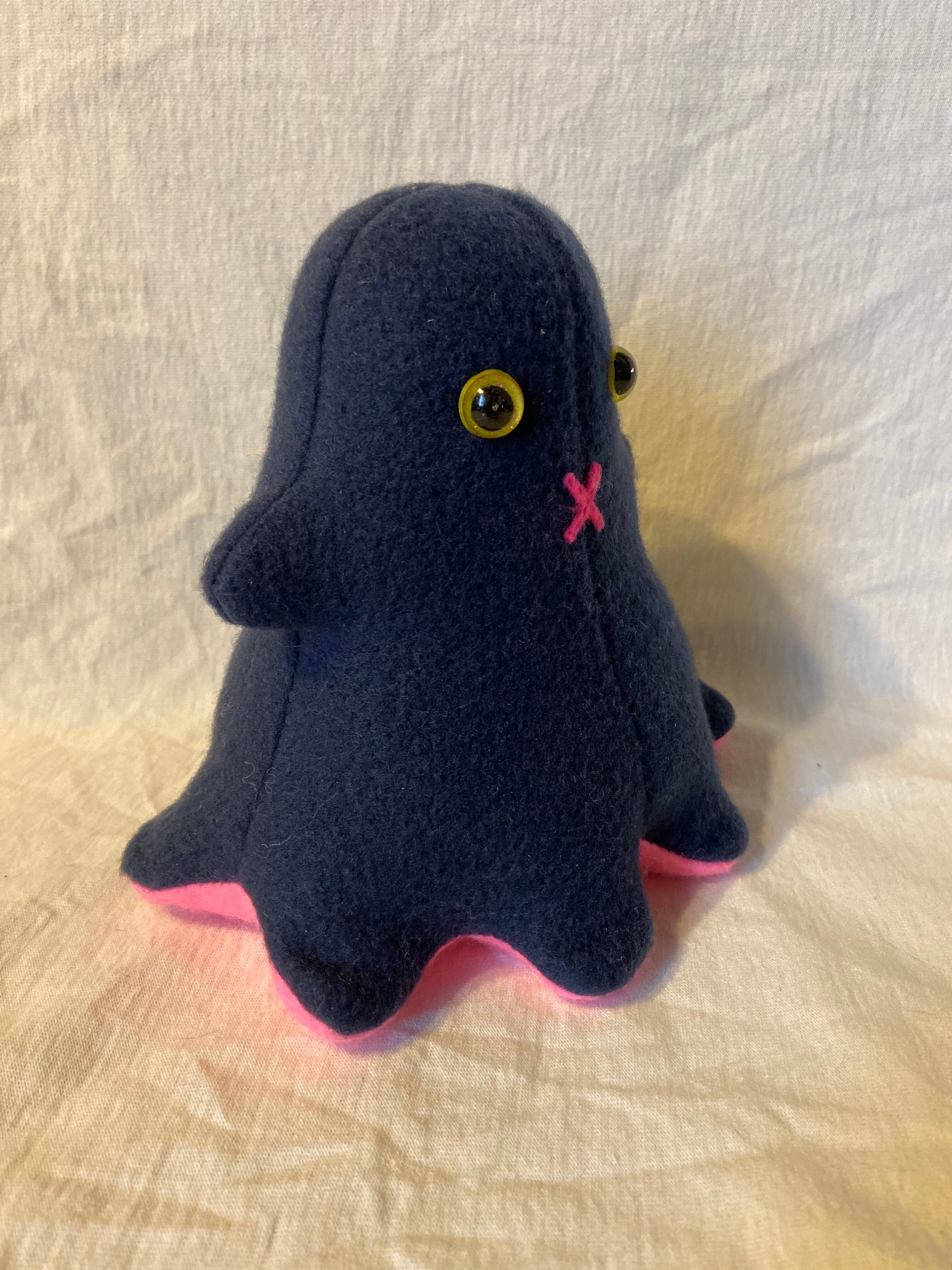 おばけをモチーフにしたぬいです。黒とピンクで作ったらタコに似ました。自立に安定感!