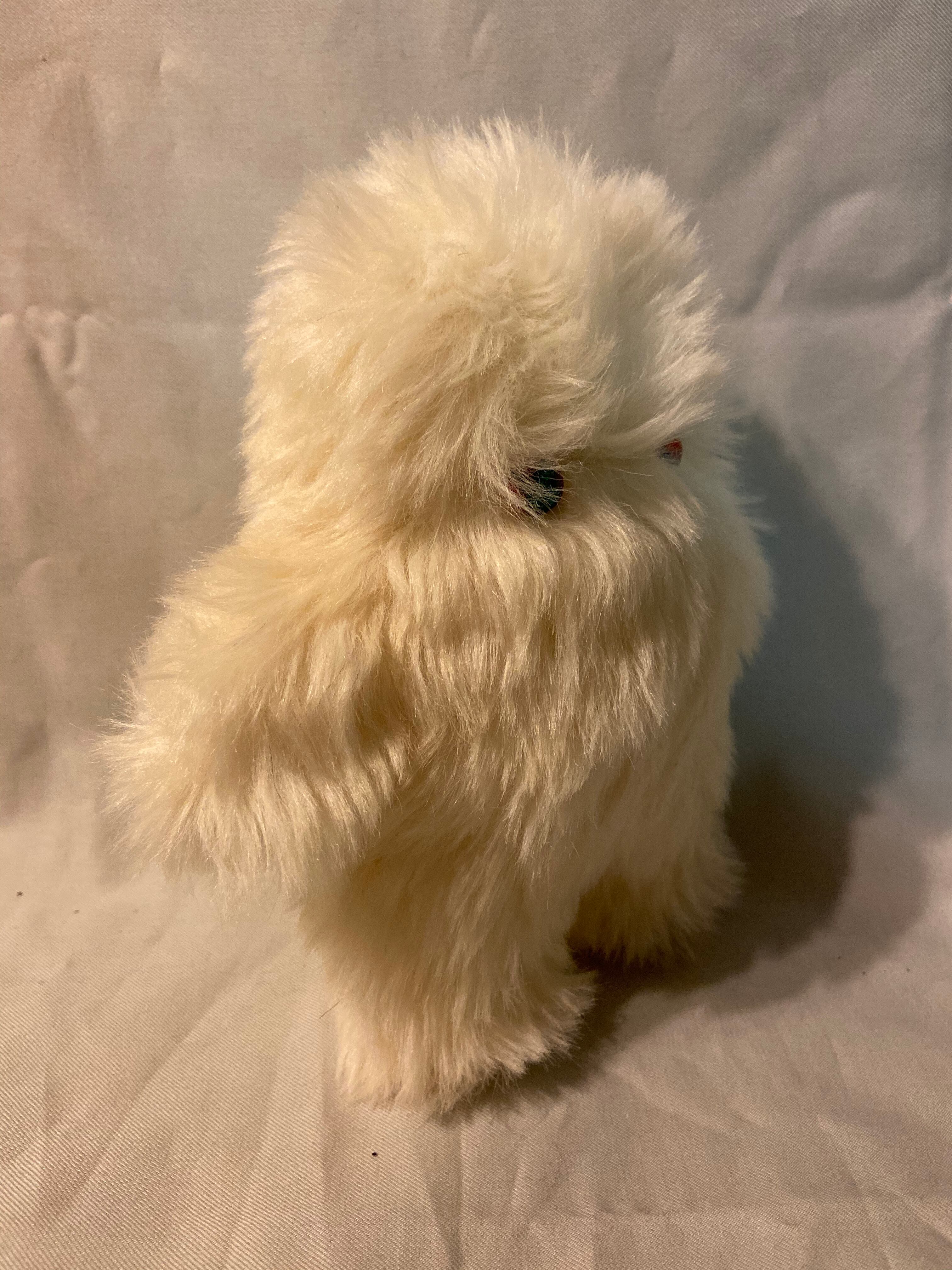 どこか雪男のような雰囲気のあるモケモケちゃんです。白い長毛のモケちゃんは初めて作ったかも知れません。ログハウスとかに似合いそうですね。